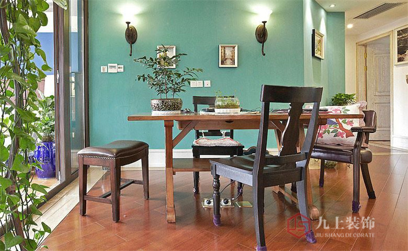 房子布局并不規(guī)整,設(shè)計師將餐廳過道的墻面粉刷成青綠色,把歐式古典的壁燈安裝上去,配上幾幅歐洲風景畫,清新的歐式風就產(chǎn)生了
