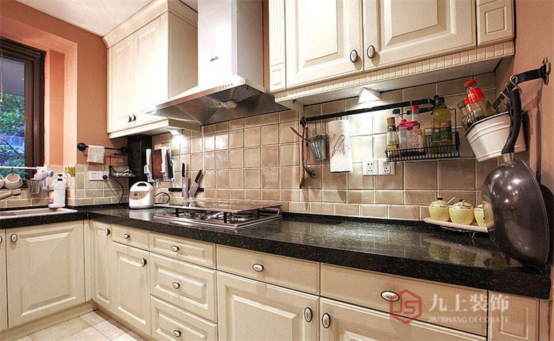為了容易清潔,廚房還是用黑色石板和褐色墻磚