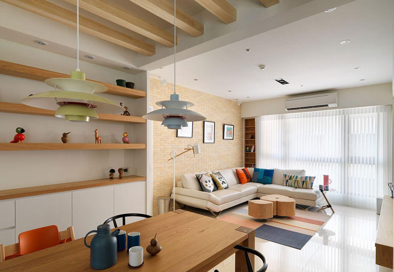 整個(gè)空間以灰白色和原木為基調(diào)色,客廳中使用了糖果色跳色抱枕,與具有格子客廳地毯相互呼應(yīng)。