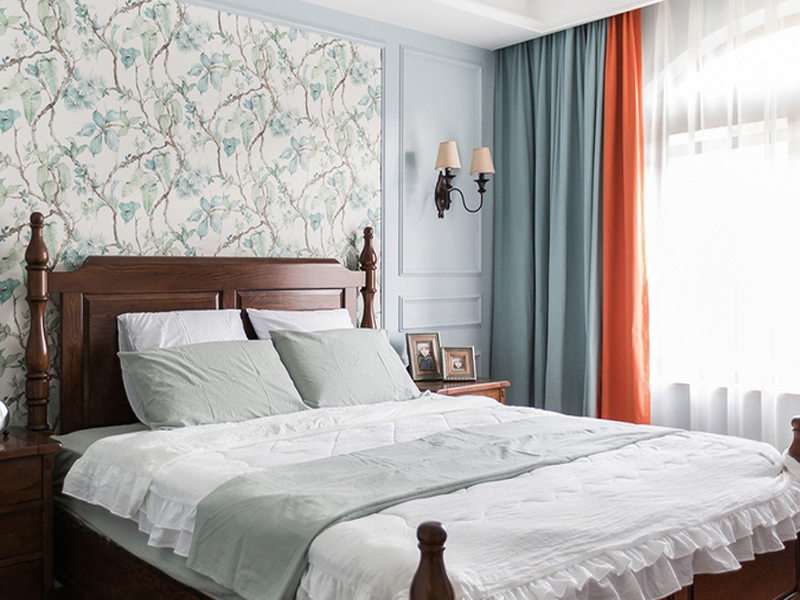 臥室作為男女主人的私密空間,布置較為溫馨?;宜{(lán)色系的空間搭配亮橘色的窗簾,用撞色把空間變的獨(dú)特又有魅力。