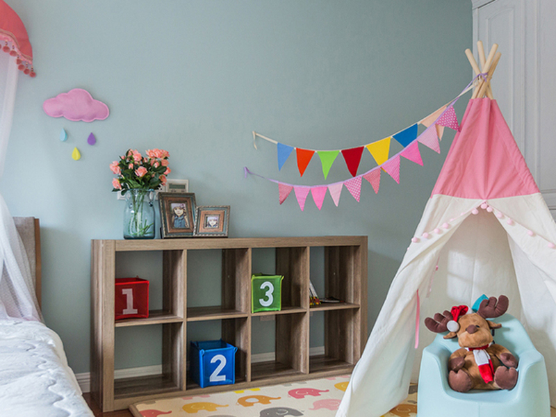 兒童房選用了較為粉嫩的顏色。除了保證舒適的睡眠氛圍,一個(gè)有趣的玩耍區(qū),也是兒童房里特別的存在。