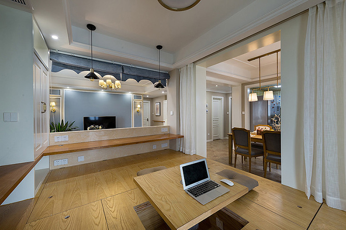 休閑區(qū)與客廳相通,乳白色的窗簾分隔餐廳,才用榻榻米的風格打造了悠閑的玩耍的區(qū)域,方可在這里工作還能玩耍。