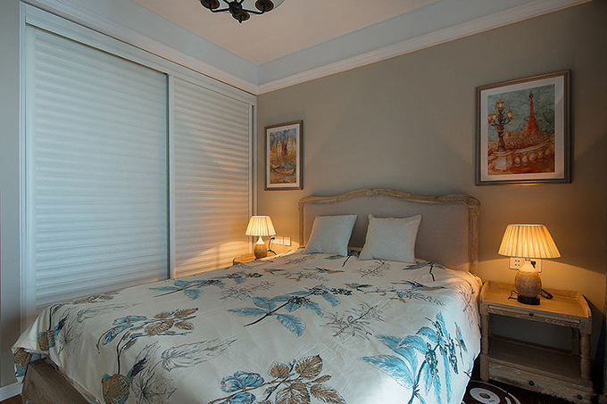 條紋色白推拉門壁櫥衣柜增大空間面積,淺色木制地板與木質(zhì)柜子、床融為一體突顯空間典雅,墻面油畫配上花式床上用品增加空間色彩。