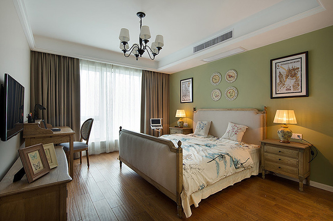 開放式吊頂配上拱形鐵柱罩式吊燈體現(xiàn)空間舒適,木制地板與舊式木制家具融為一體突顯室內(nèi)溫馨,綠色的墻面配上版畫增加空間色彩。
