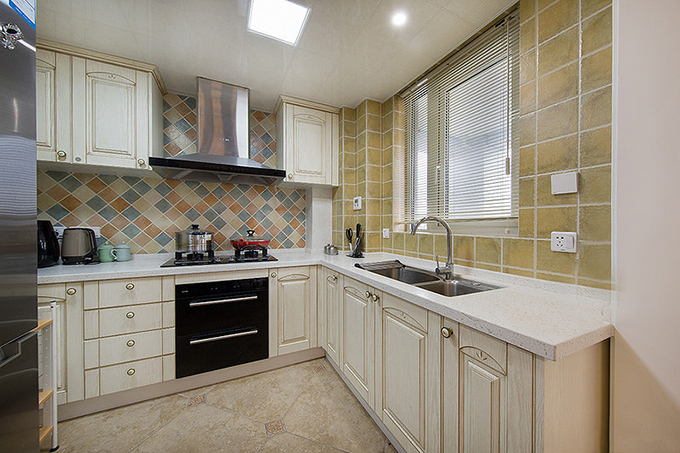 花式地磚與乳白色的櫥柜配搭體現(xiàn)空間色彩一直,花色和黃色壁磚配搭增加室內(nèi)的色彩,白色的灶面突出廚房容易打掃而整潔干凈。