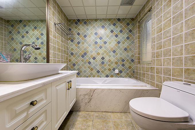 開放式的衛(wèi)生間,乳白色和白色的用品突出空間清新典雅,淡色花式地磚配搭黃色小方塊壁磚體現(xiàn)出樸素氣息,真面多色壁磚增加室內(nèi)色彩。